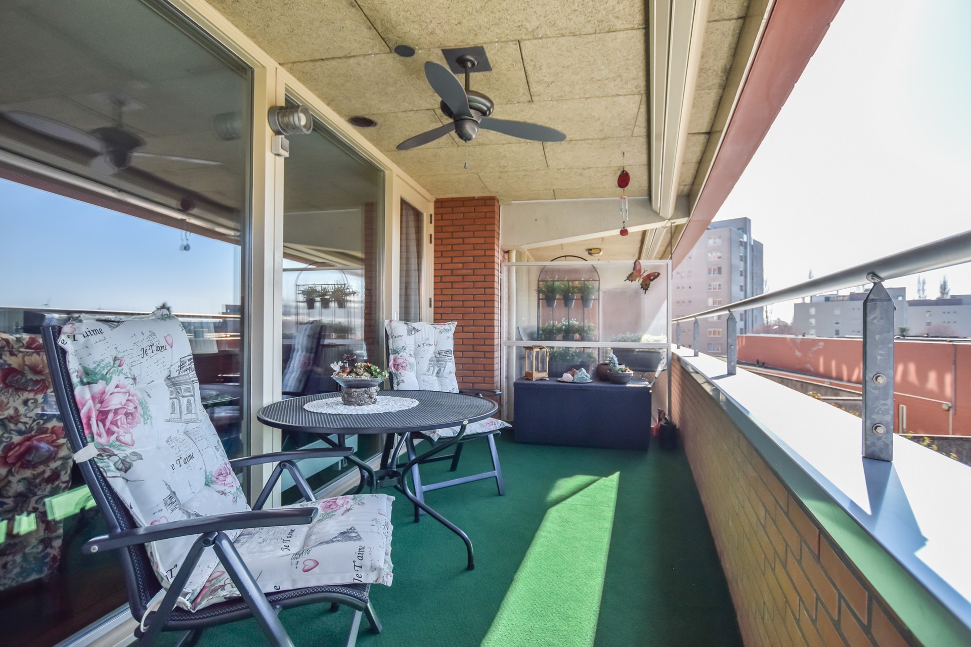 Het balkon is voorzien van een elektrisch bedienbare zonnewering en een plafond-ventilator.