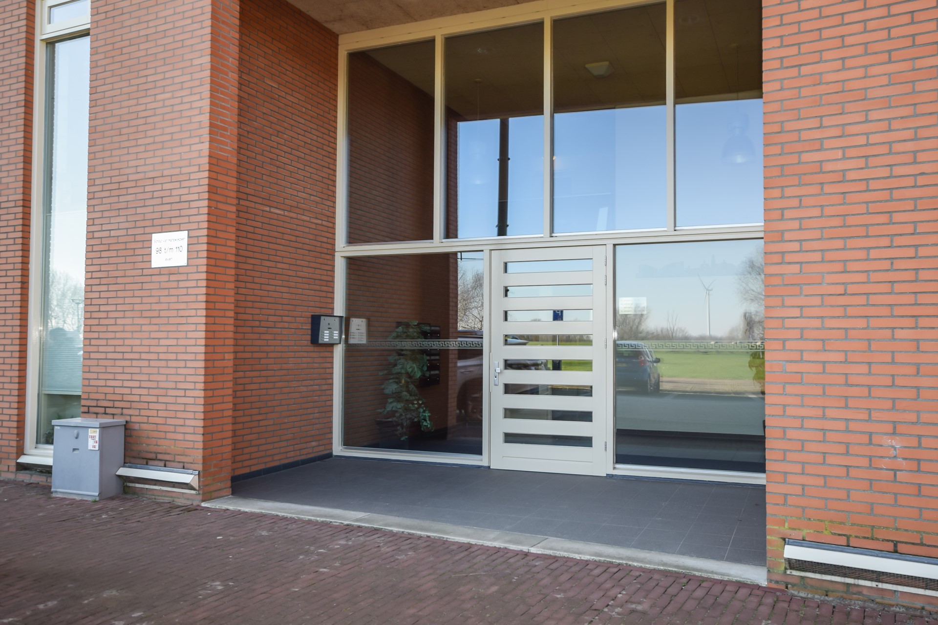 Via de centrale entree aan de voorzijde van het appartementengebouw komt u in de centrale en ruime hal, welke is voorzien van een videofooninstallatie, brievenbussen en welke de toegang geeft tot het trapportaal en de lift.