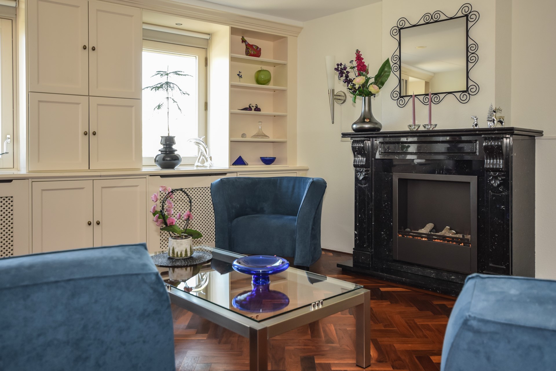 Vanuit de hal bereikt u de sfeervolle woonkamer. De ruime woonkamer van circa 25 m2 is eveneens verzorgd afgewerkt met een zelfde parketvloer als in de hal, de wanden zijn afgewerkt met Spachtelputz. De woonkamer is voorzien van een sfeerhaard (met schouw) en een mooie, stijlvol ingebouwde (op maat gemaakte) kastenwand en radiator-ombouwen. De ramen zijn voorzien van elektrisch bedienbare zonnescreens.