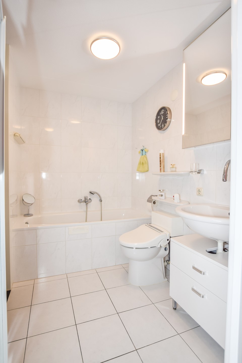 Terug in de hal komen we vervolgens in de ruime, geheel betegelde badkamer (circa 3,50 x 1,69 meter).